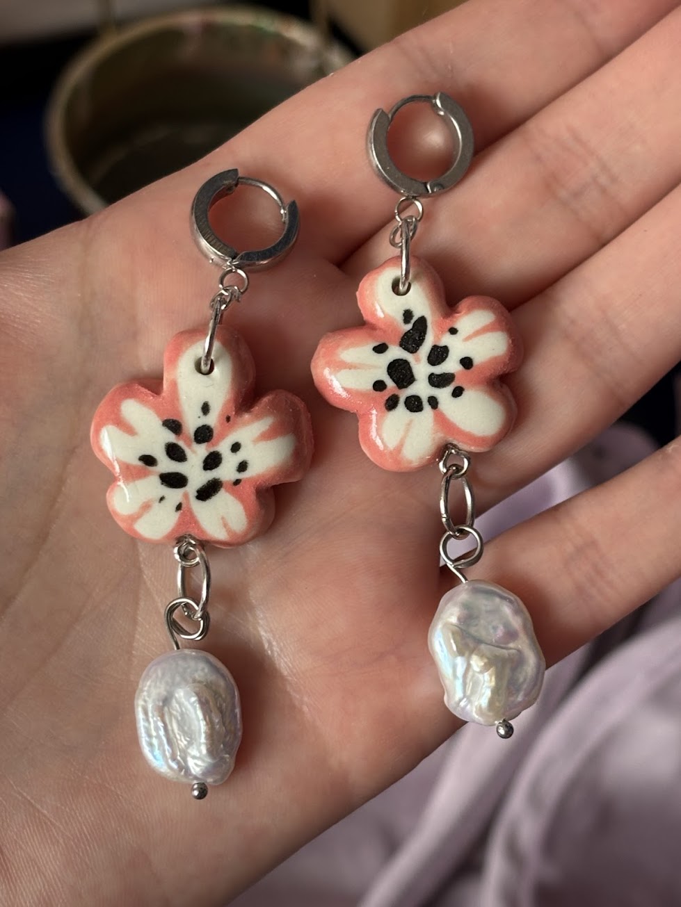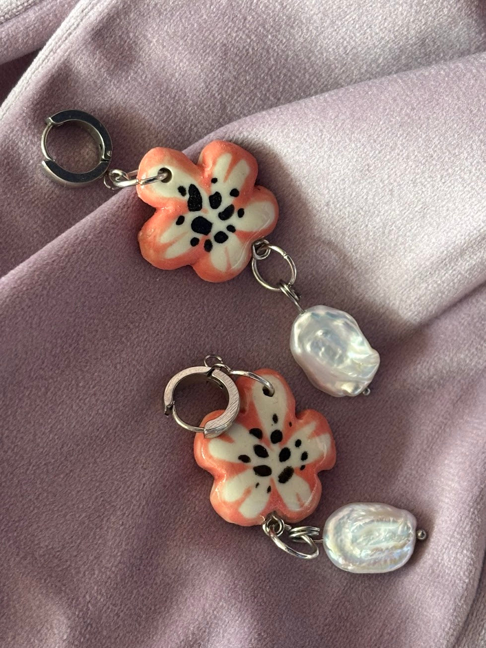 Kolczyki zostały stworzone na bazie mojej autorskiej ilustracji – każdy ceramiczny element jest ręcznie malowany, dlatego nie znajdziesz dwóch identycznych par.